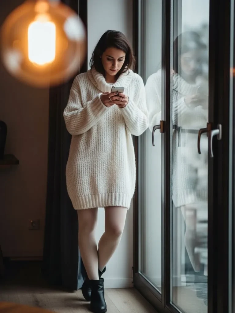 The layered knits create a flattering silhouette while keeping everything warm and refined.