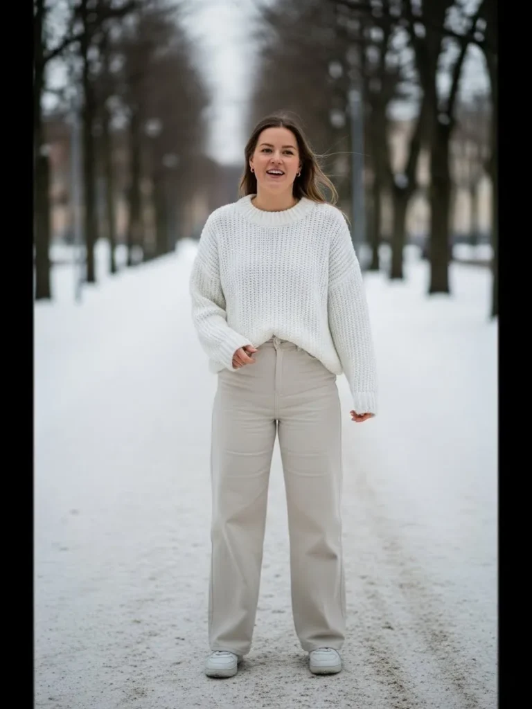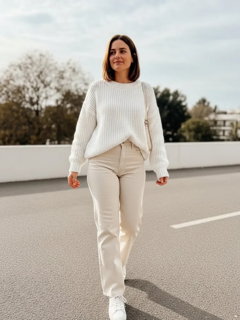 This outfit features a chunky white knit sweater paired with relaxed light beige trousers and clean white sneakers.