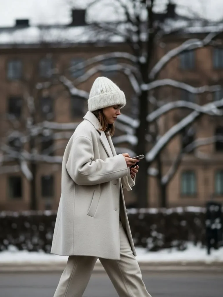 This look features a light wool coat layered over soft neutrals and finished with a cozy white knit beanie.