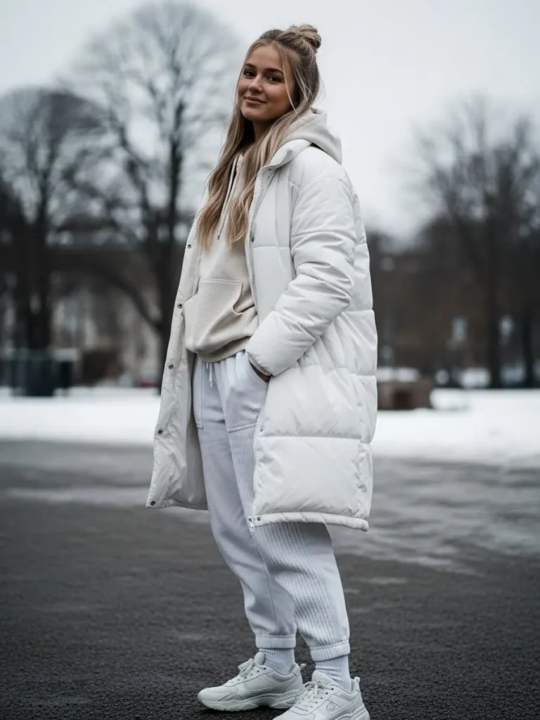 This look combines a long white puffer jacket with a hoodie and soft jogger style pants.