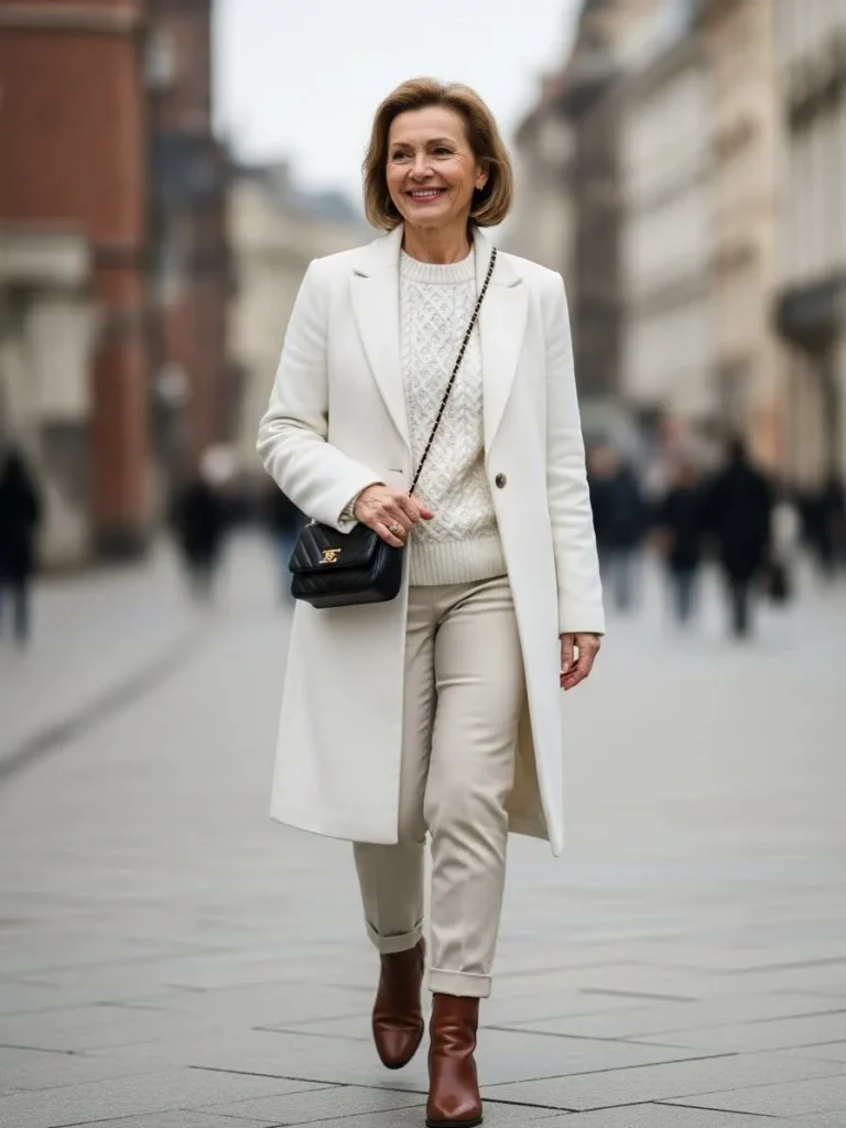 I love how crisp white knits, coats, and boots instantly make an outfit feel fresh, polished, and quietly confident.