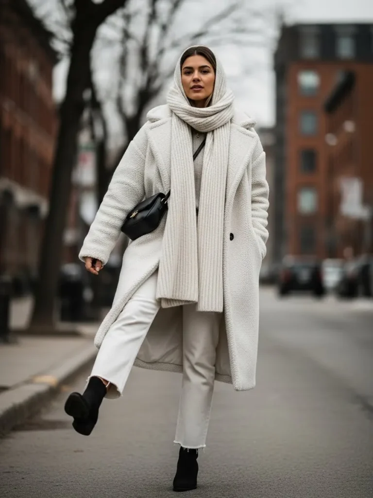 A plush white coat paired with a chunky scarf and straight leg trousers creates a soft winter moment.