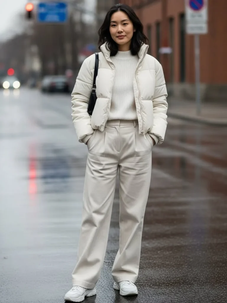 This look combines a cropped white puffer jacket with a ribbed knit sweater and relaxed trousers.