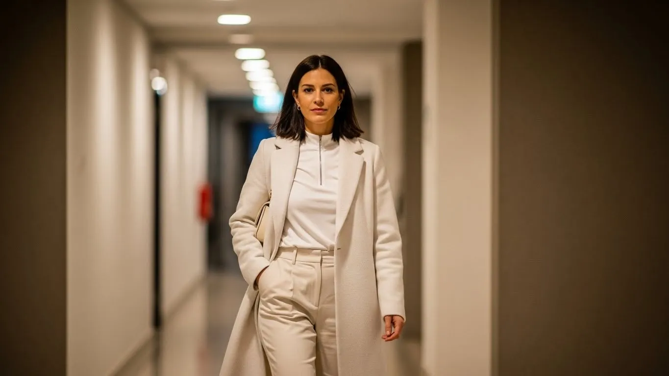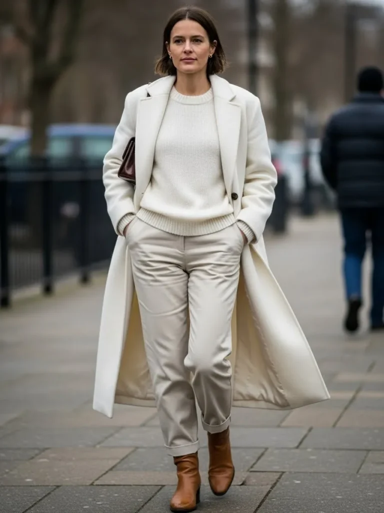 This look pairs a crisp white wool coat with a soft knit sweater and tailored light beige trousers.