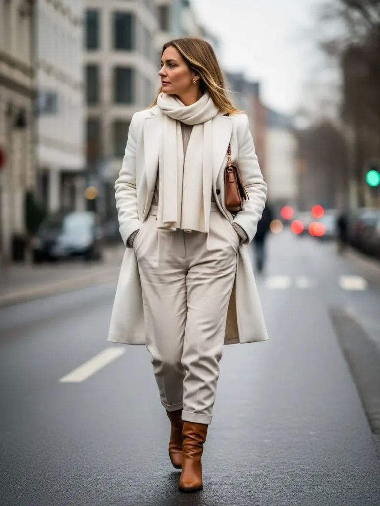 The scarf makes it feel cozy, while the clean tones keep it chic.