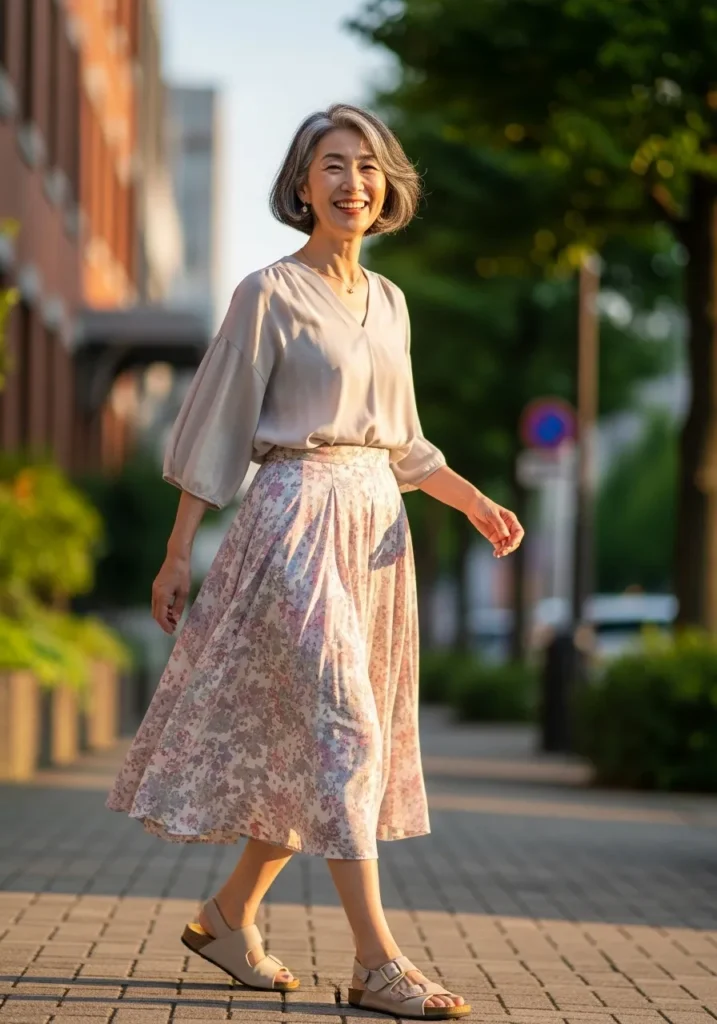 This outfit combines a loose light blouse with a flowing floral midi skirt in soft pastel shades. The blouse has a gentle drape and relaxed sleeves, while the skirt moves beautifully with every step. Neutral flats tie everything together for a romantic but wearable spring look.