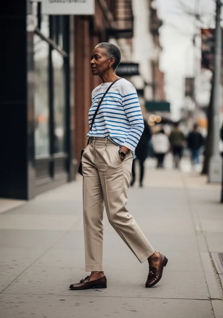 This outfit pairs a classic striped top with beige cropped trousers and comfortable flats. The stripes feel fresh and playful, while the trousers keep the look grounded and polished. The overall silhouette is relaxed but still very intentional.