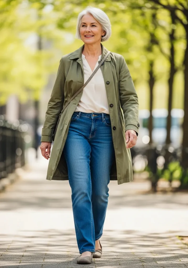 This outfit features a lightweight olive green jacket layered over a neutral top and classic blue jeans. The jacket adds structure, while the denim keeps the look relaxed and approachable. Comfortable shoes complete the outfit for an easy walking friendly style.