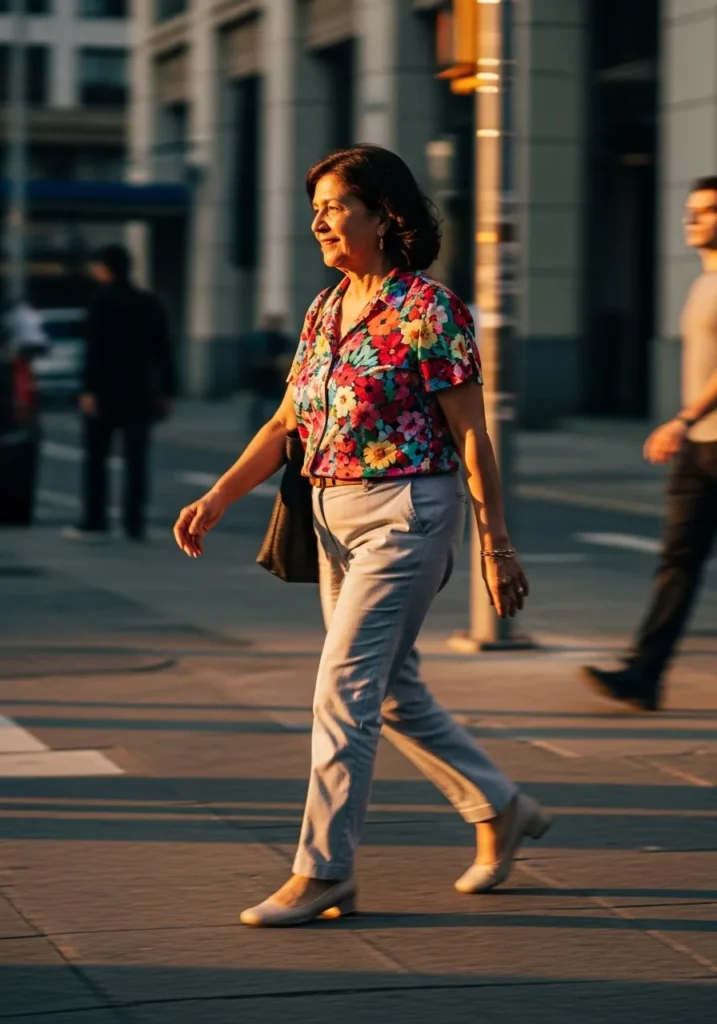 The colorful top lifts the whole look and draws the eye upward which always feels flattering. It is the kind of outfit I would wear when I want to feel cheerful and confident while still staying comfortable all day.
