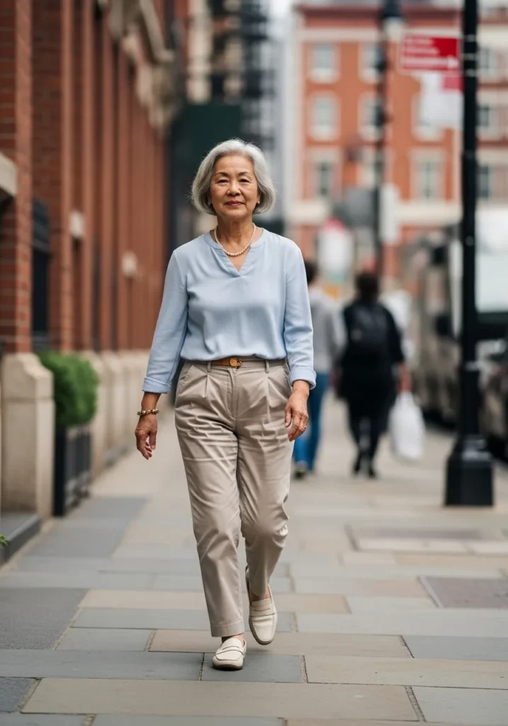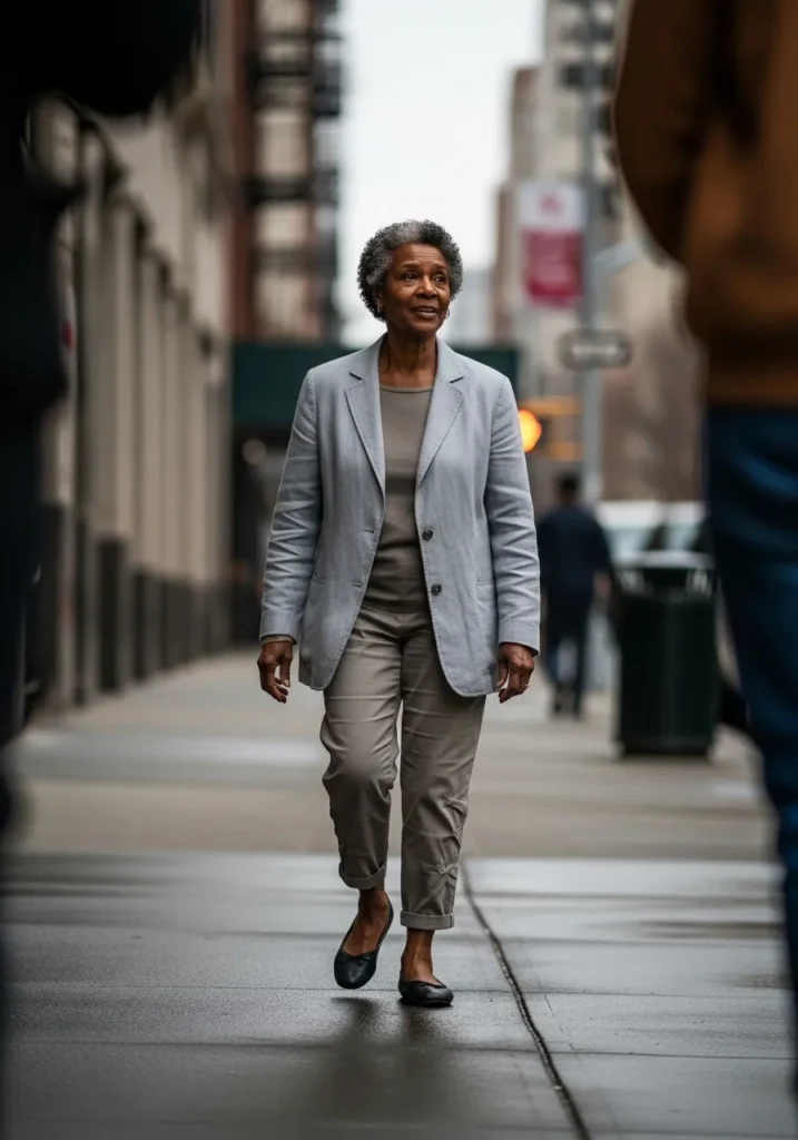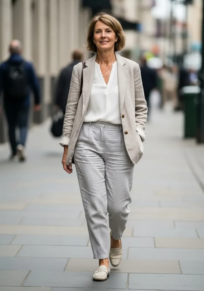 This outfit works so well because it mixes classic and casual in the best way. I love how the blazer instantly sharpens the look, while the sneakers keep it from feeling stiff or dated. It feels youthful, practical, and perfect for days when comfort really matters.