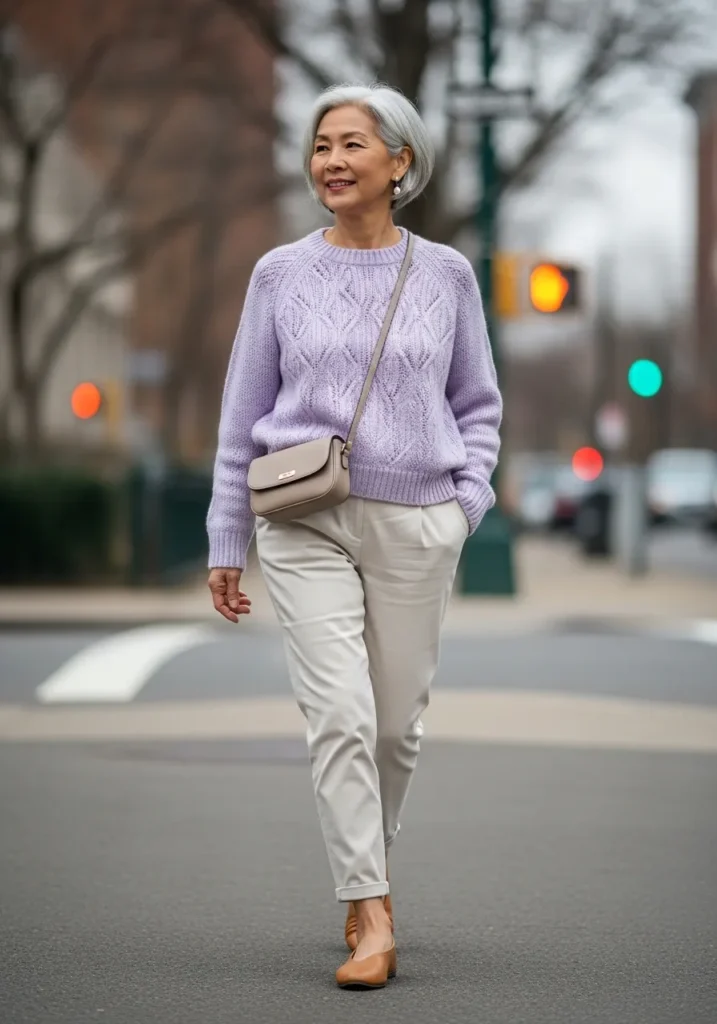 I love how this look balances softness with structure. The lavender brightens the face without being loud, and the tailored pants create a flattering shape that still feels relaxed. This is the kind of outfit I’d wear on a spring morning when I want to feel comfortable but still look like I made an effort.