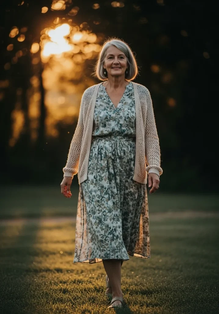 This outfit showcases a floral midi dress layered with a light cardigan for warmth and softness. The gentle floral print feels classic and spring ready while the cardigan adds texture and comfort. The length and flow of the dress create an elegant and easy silhouette.