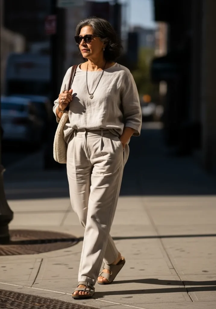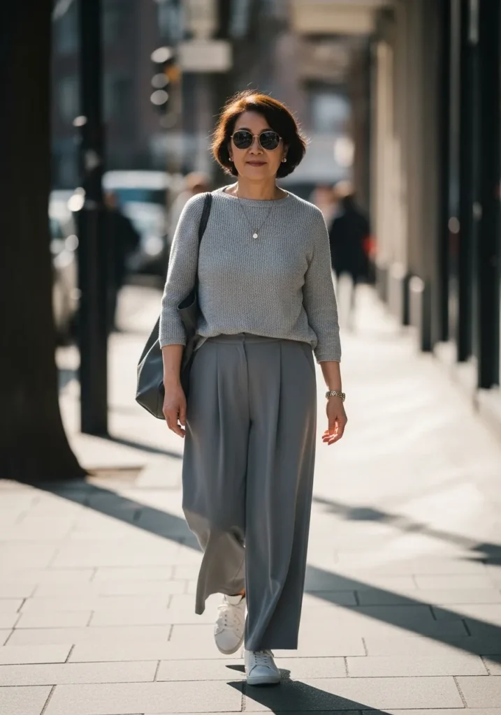 This outfit plays with shades of grey using a relaxed top and wide leg pants that flow beautifully when walking. The monochrome palette feels modern and understated, while comfortable shoes keep it practical for everyday wear.