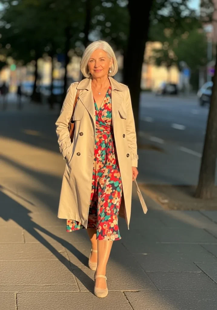 A flowy floral midi dress takes center stage here, layered under a timeless beige trench coat that adds instant elegance. The dress brings movement and color while the trench keeps things grounded and classic. Nude or neutral shoes tie everything together for a graceful walk through the city.