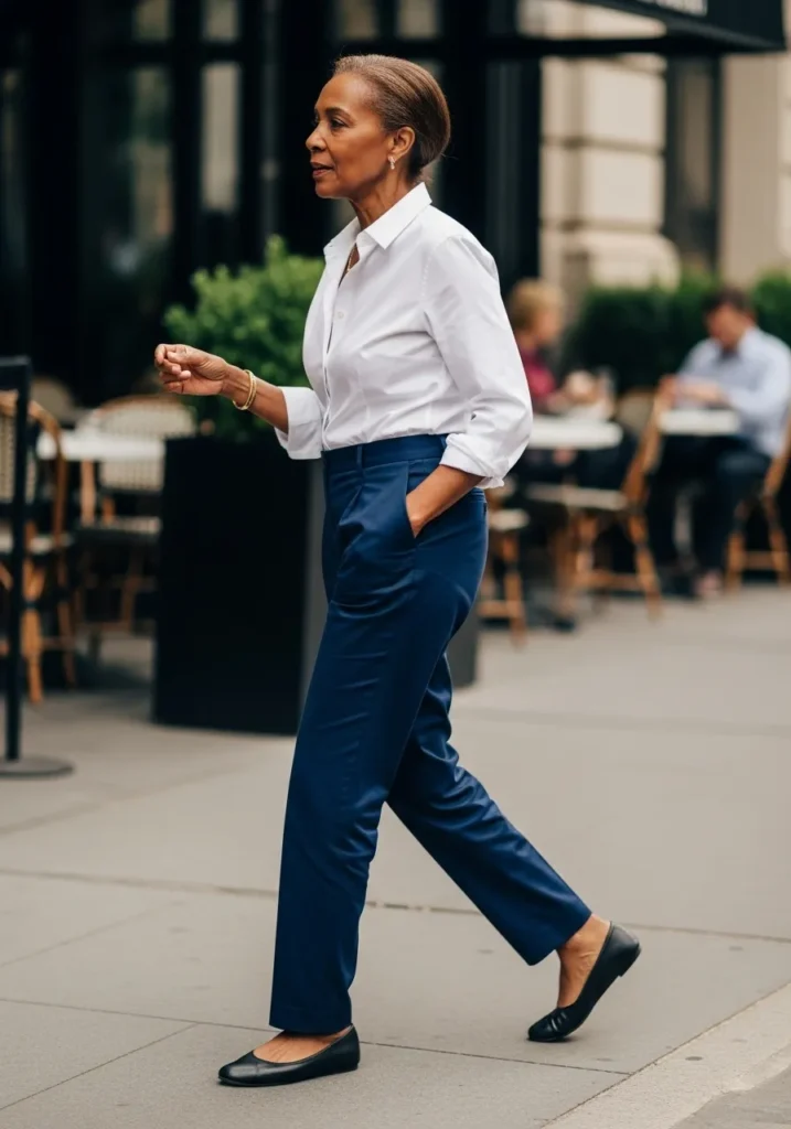 This look is built around a crisp white button down tucked neatly into navy tailored pants. The clean color combination feels timeless and confident, especially with simple flats and minimal accessories. Everything about this outfit feels sharp yet effortless.