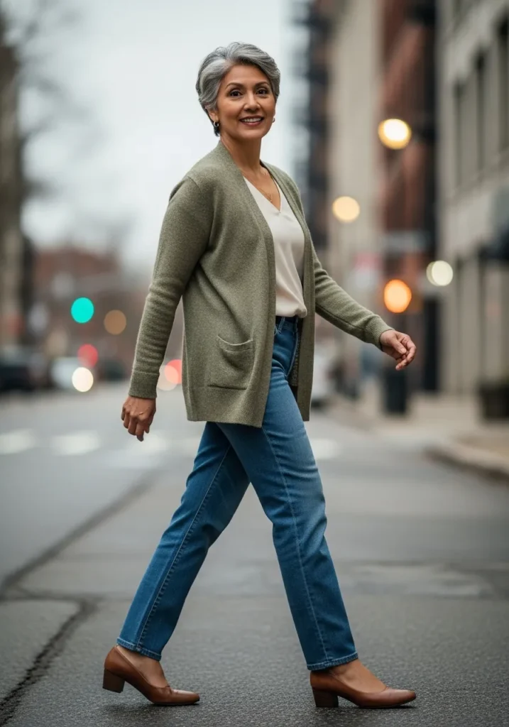 A soft olive green cardigan is layered over a simple top and paired with classic blue jeans. The cardigan adds warmth and texture while the denim keeps things casual and wearable. Comfortable flats or low heels make this a perfect daytime spring look.