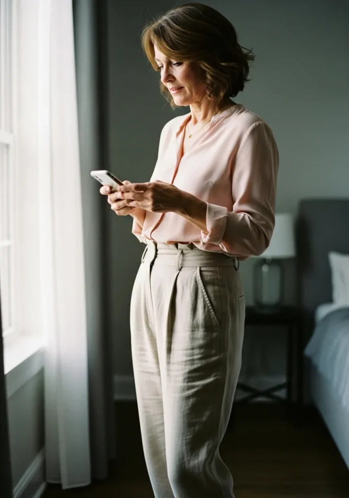 I really love how gentle this look feels. The blush color adds warmth without overpowering, and the loose yet tailored pants keep things flattering. This is the kind of outfit I’d wear when I want to feel calm, feminine, and quietly confident.
