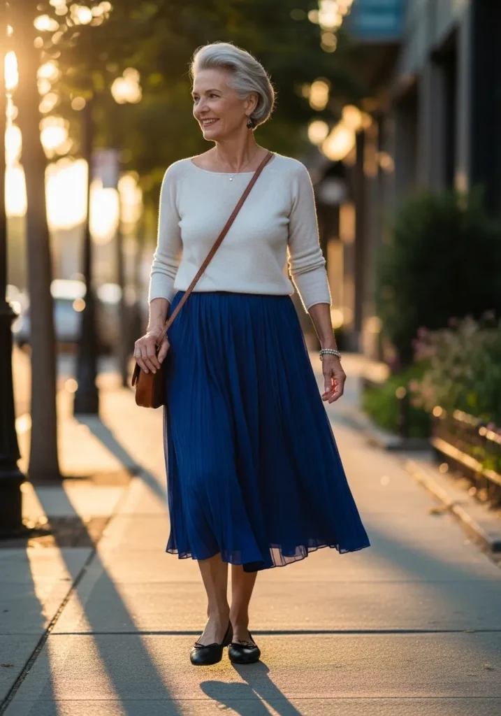 A lightweight neutral sweater is paired with a rich blue midi skirt that moves gracefully with every step. The contrast between the soft top and flowing skirt creates a balanced and elegant spring outfit. Simple flats and a small crossbody bag complete the look.