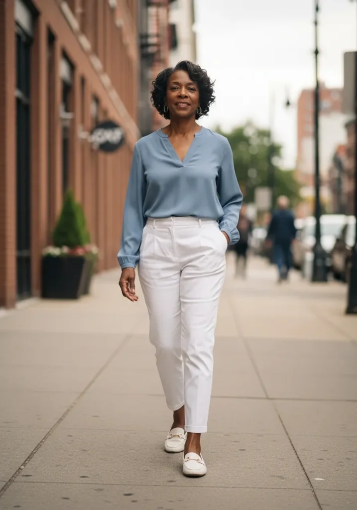 A breezy light blue blouse is styled with crisp white cropped pants for a clean and fresh spring look. The soft top keeps things relaxed, while the white pants add brightness and structure. Neutral shoes make it feel effortless and wearable.