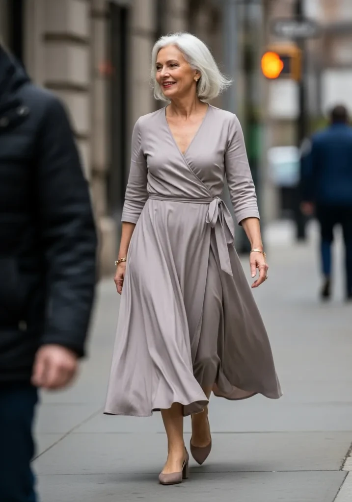 I love how this kind of dress does all the work for you without feeling fussy. The wrap shape naturally defines the waist in the most comfortable way, and the soft neutral color feels timeless instead of trendy. It is one of those outfits that makes you feel put together the moment you step outside, even on a casual day.