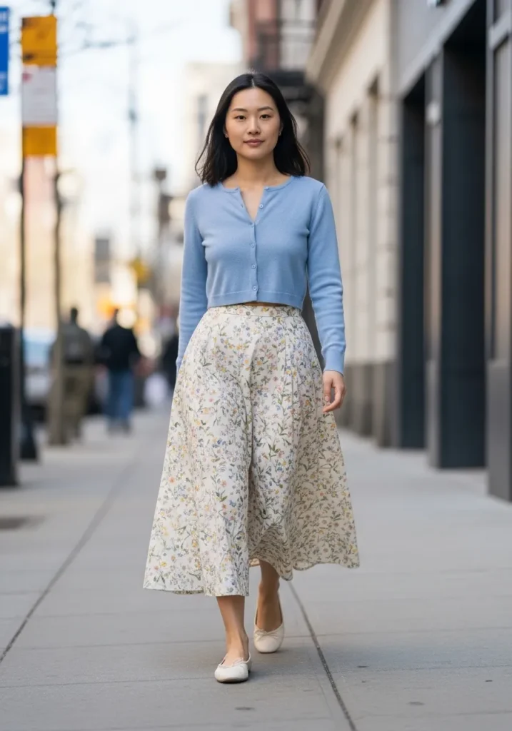 Here we have a light blue buttoned cardigan tucked into a cream and blue printed midi skirt. The soft knit contrasts nicely with the flowy skirt fabric. Neutral flats keep everything balanced and wearable for everyday spring plans.