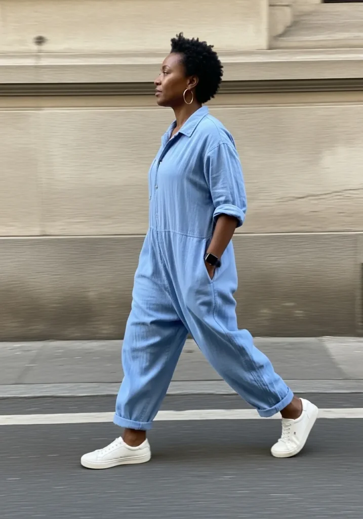 This outfit is all about comfort with a light blue jumpsuit that has a loose fit and rolled sleeves. White sneakers add a casual touch that makes the whole look feel modern and practical. The clean lines keep it looking polished even though it is super relaxed.