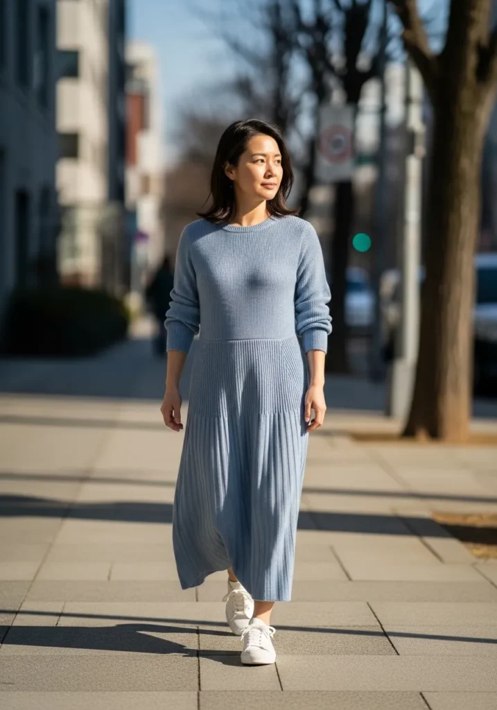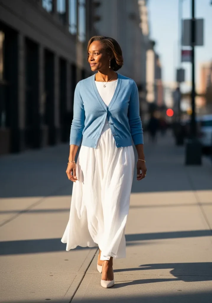 Here we see a light blue cardigan layered over a white midi dress with gentle movement. The cardigan adds warmth without weighing the outfit down. Simple flats keep the look grounded and comfortable.