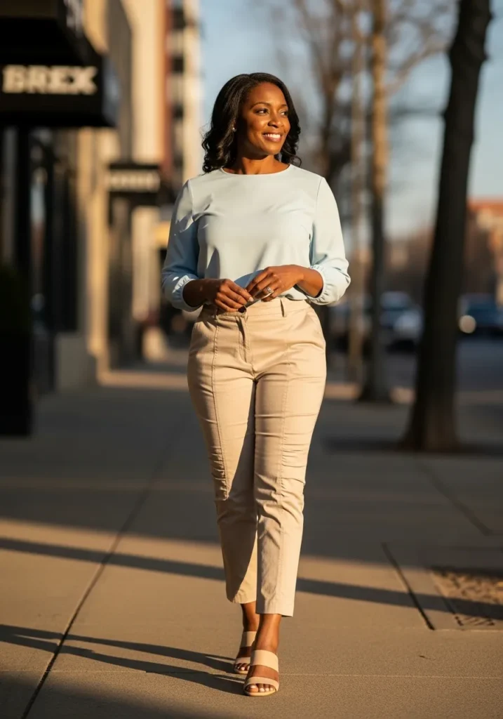 This outfit works because it feels balanced and flattering. I really like how the light blue brightens up the neutral pants. It feels calm and confident and perfect for days when I want to look polished without effort.