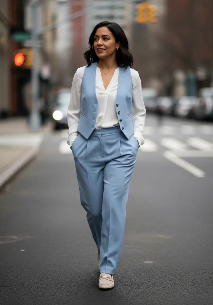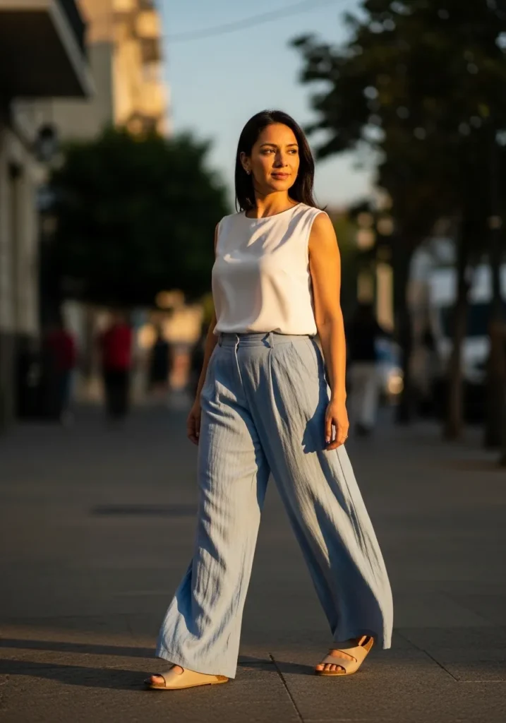 This look combines a sleeveless white top with flowy light blue pants that move beautifully as you walk. The silhouette feels relaxed and breezy which is perfect for spring afternoons. Neutral shoes keep the outfit balanced.