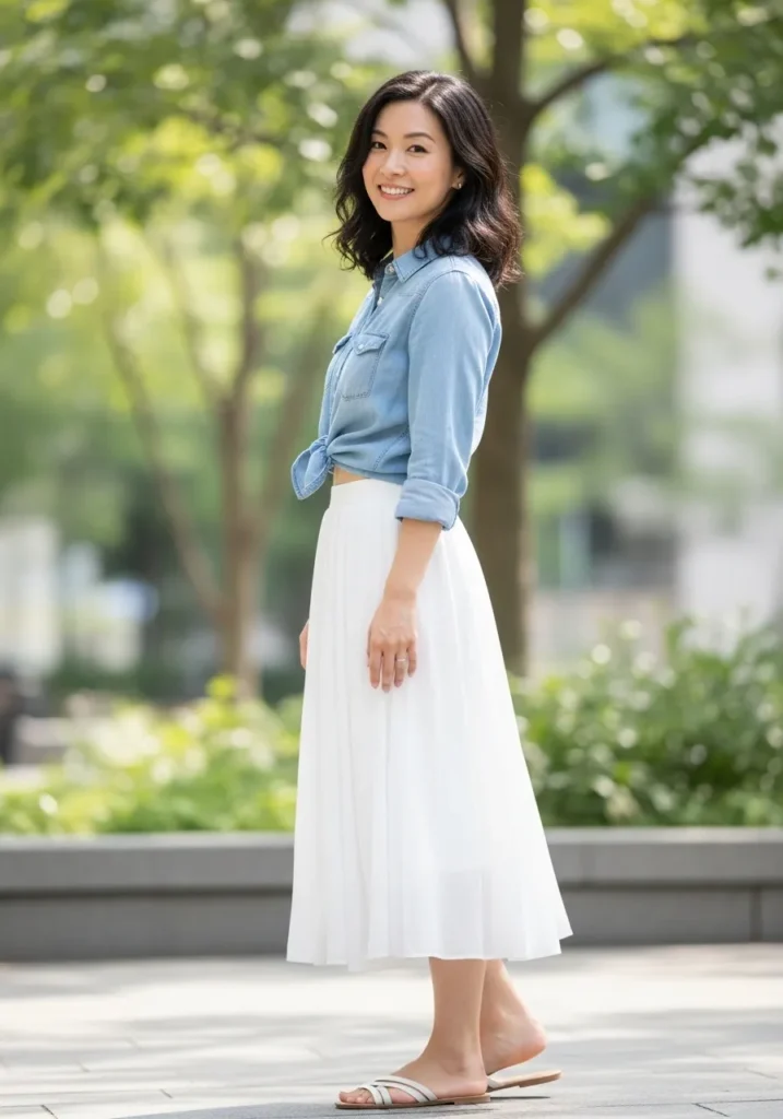 This look pairs a cropped light blue button up shirt with a flowy white midi skirt. The fabrics feel light and breathable which is perfect for spring days. Flat sandals keep everything relaxed and easy.