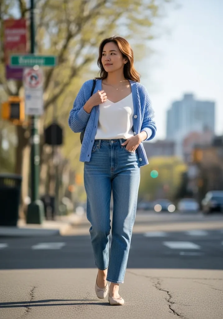 This look features a light blue cardigan layered over a simple white top paired with classic blue jeans and neutral flats. The soft knit texture and relaxed fit give it an easy spring feel while the light blue shade keeps everything fresh and airy. It feels like the kind of outfit you throw on for a city stroll without overthinking it.