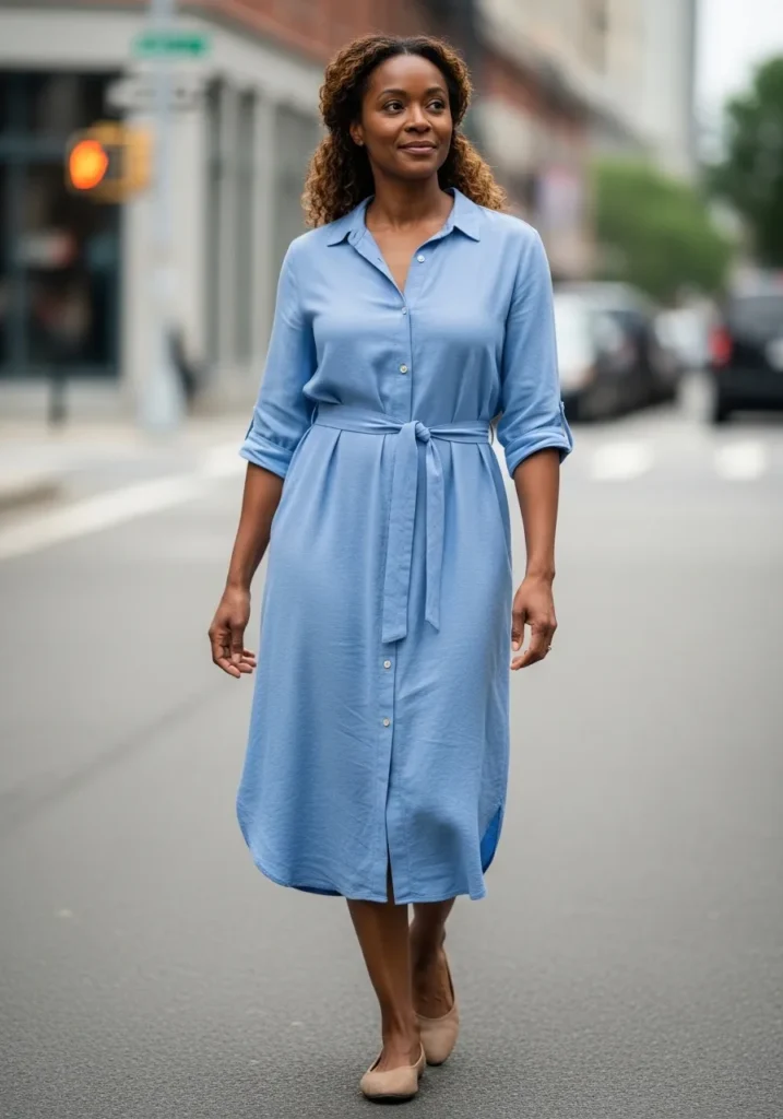 This outfit features a light blue buttoned shirt dress with a relaxed midi length. The fabric looks lightweight and breathable which is ideal for spring weather. Neutral flats complete the look in a simple way.