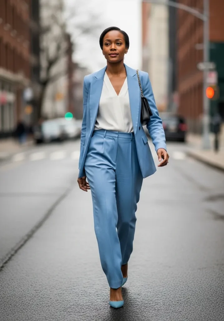 I really love how this outfit balances structure and softness. The light blue shade makes the suit feel fresh instead of heavy and I think it is such a chic way to stand out while staying classy. This is the kind of look that makes me walk a little taller.