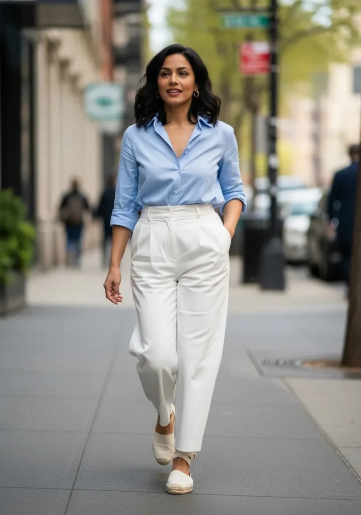 This outfit features a light blue button down shirt tucked into crisp white pants for a clean fresh look. The structured shirt contrasts nicely with the bright white bottoms creating a polished spring outfit. Everything feels light breathable and effortless.