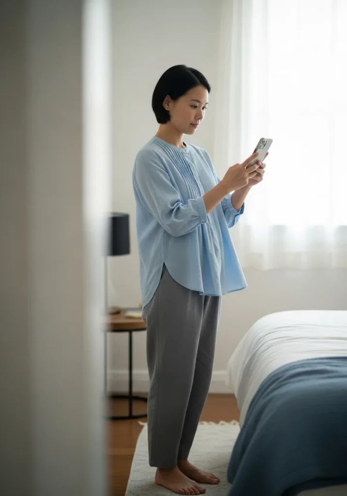 This outfit includes a light blue cardigan layered over a neutral top with relaxed gray pants. The fabrics look soft and comfortable making it ideal for slow spring mornings at home. The light blue tone keeps it from feeling too lounge focused.