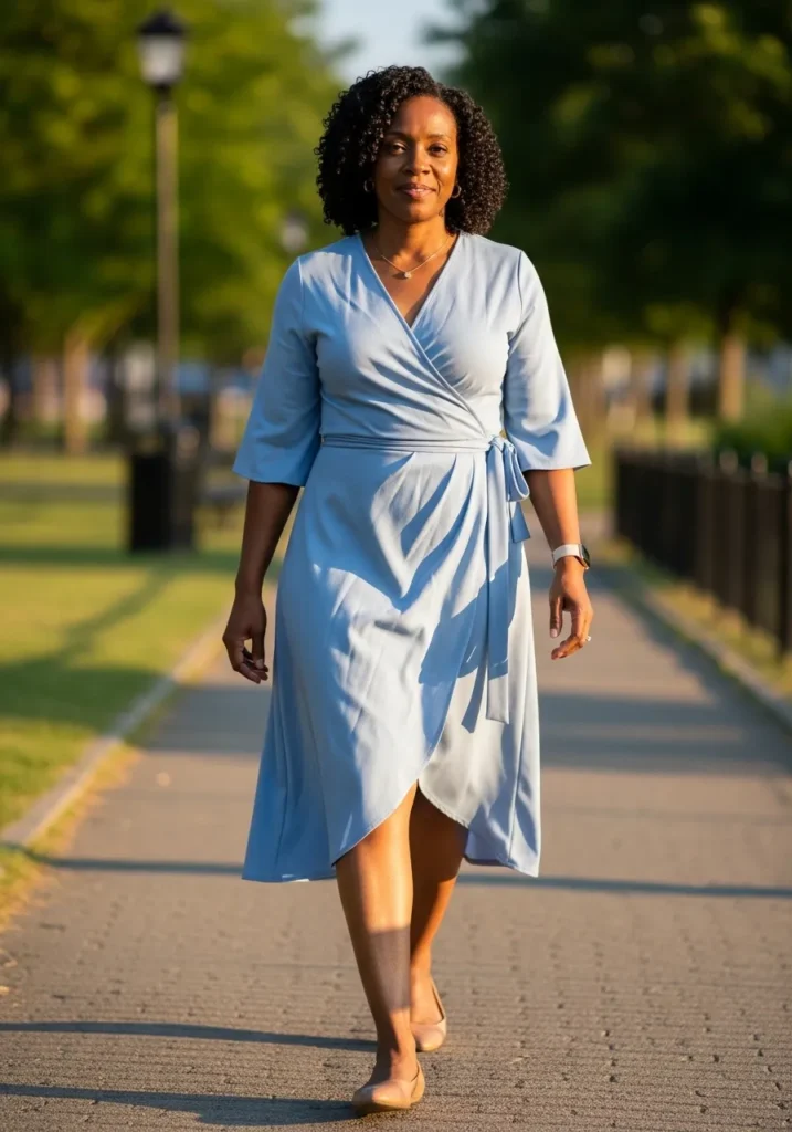 This look showcases a light blue wrap dress with a flattering waist tie and a midi length. The silhouette feels feminine and easy while the color keeps it soft and spring ready. Paired with simple shoes it looks graceful and effortless.