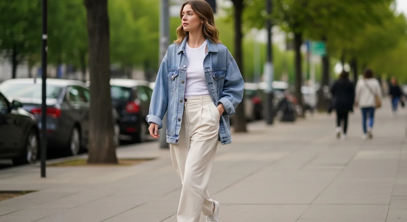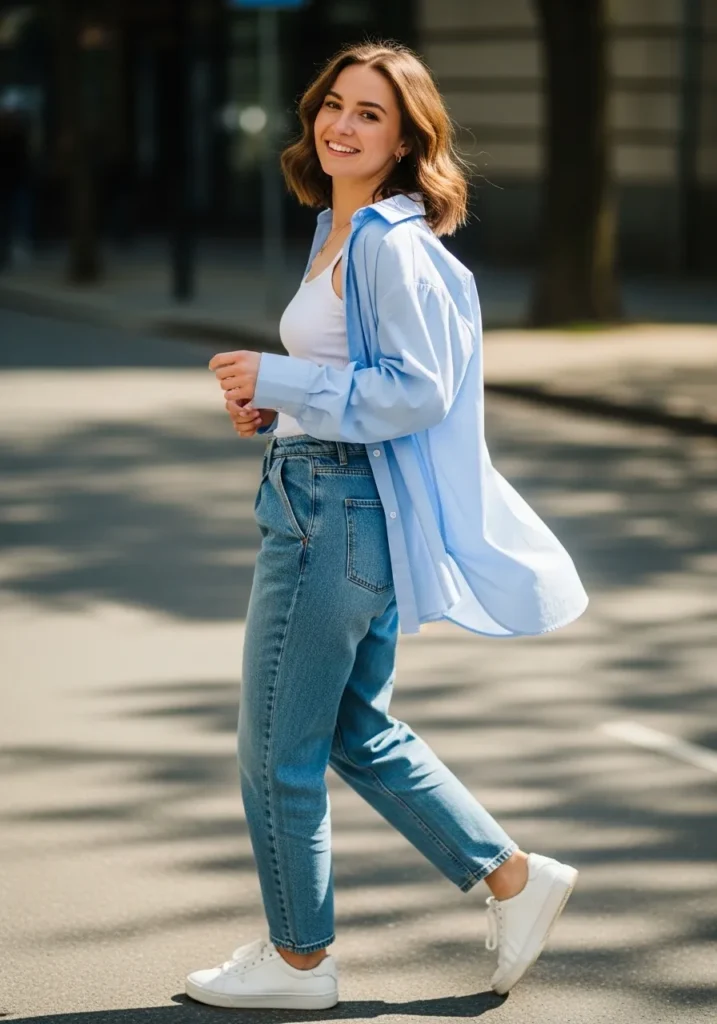 This outfit combines an oversized light blue shirt worn open over a white top with classic blue jeans and white sneakers. The loose layers create an easy street style vibe that feels current and wearable. The light blue shirt adds a fresh pop without feeling loud.