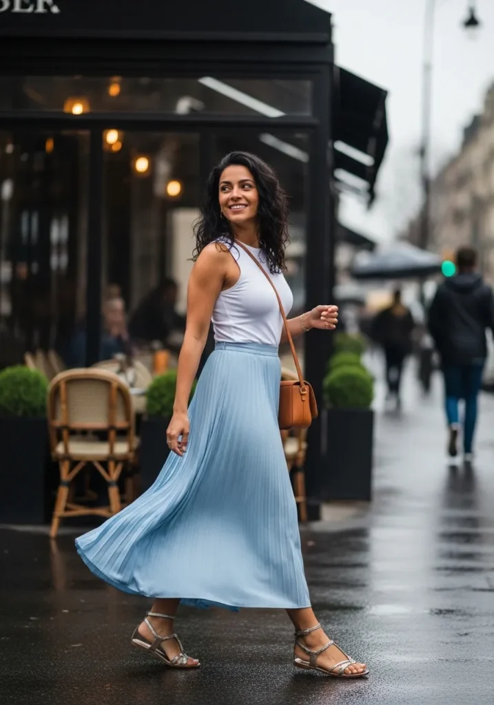 This look features a light blue midi dress with a soft flowy skirt that moves beautifully with every step. The sleeveless cut keeps it airy while the fitted waist adds just enough shape. Paired with simple flat sandals and a small shoulder bag, the whole outfit feels effortless and perfect for spring strolls.