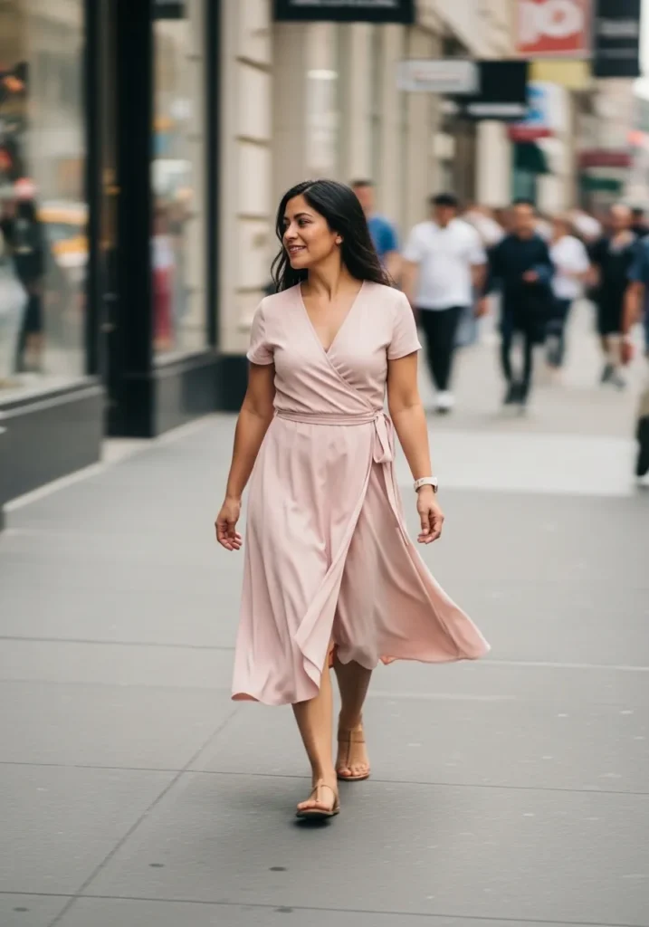 A blush pink midi dress flows effortlessly with a flattering wrap style silhouette. The fabric drapes softly as she walks, giving the outfit a romantic and feminine feel. Simple flats keep the look grounded and perfect for a spring day in the city.