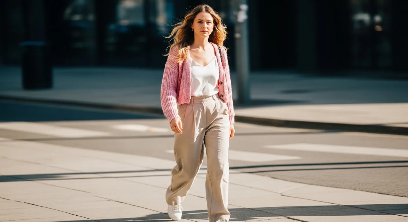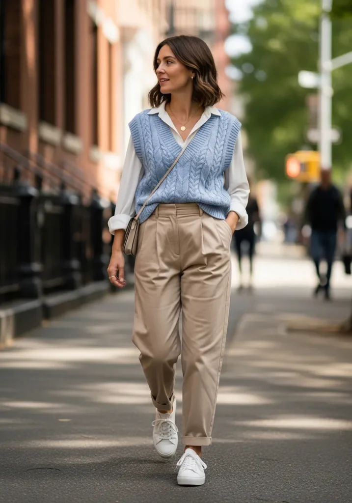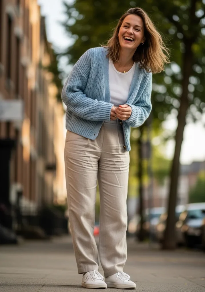 A baby blue cardigan is layered over a white top and paired with soft beige pants. The cardigan adds a cozy texture while keeping the overall look light. Casual shoes make the outfit feel relaxed and approachable.