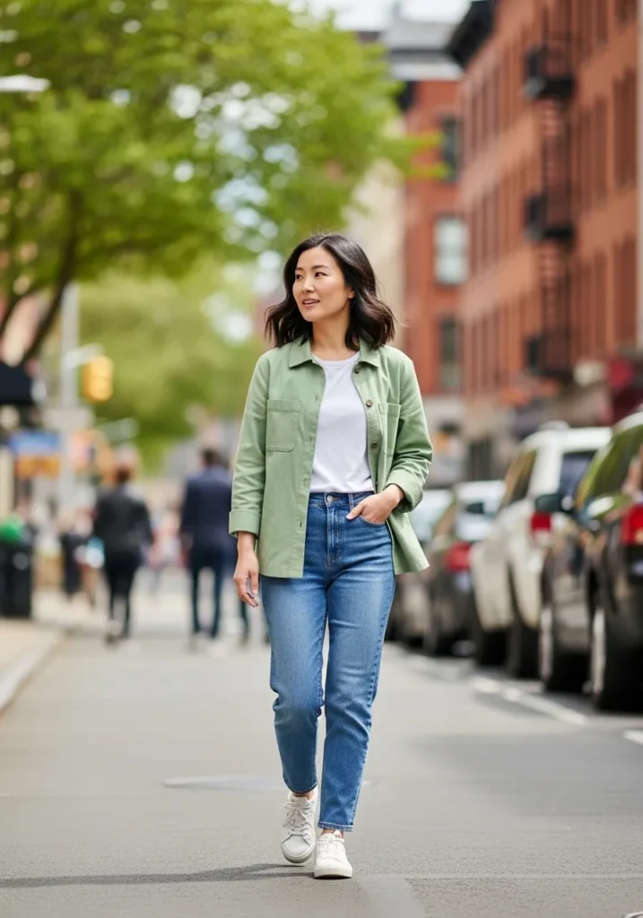 A soft sage green jacket is layered over a white top and paired with classic blue jeans. The pastel jacket adds a fresh spring twist to a very familiar outfit. White sneakers keep everything casual and comfortable.