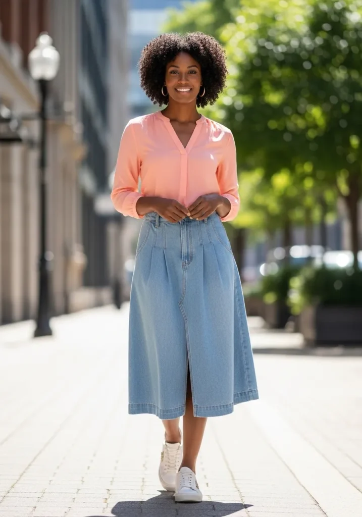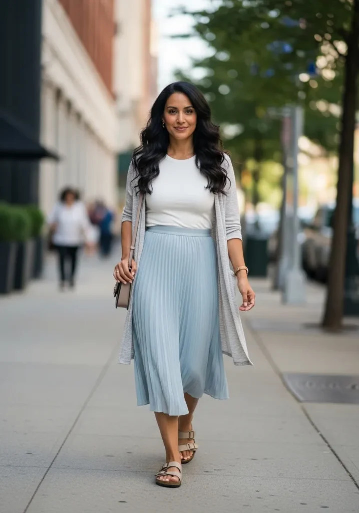 A clean white fitted tee is paired with a powder blue pleated midi skirt that moves beautifully while walking. The skirt has a soft flow and a light fabric that feels perfect for spring weather. Neutral sandals and a simple shoulder bag keep the look easy and balanced.