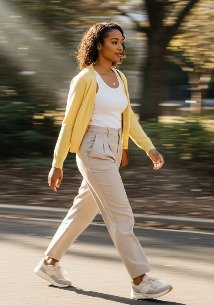 Pale Yellow Cardigan With Relaxed Neutral Pants