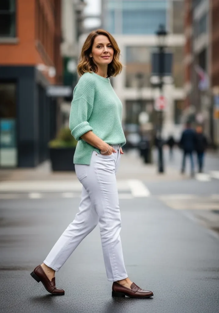 A mint green sweater is paired with slim white jeans for a clean and modern spring outfit. The sweater has a relaxed fit that feels cozy yet light enough for warmer days. Simple flats keep the look casual and wearable.
