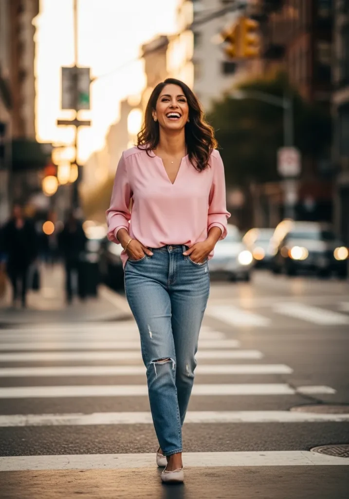 A soft blush pink blouse is styled with classic blue jeans for a timeless spring outfit. The blouse has a relaxed drape that adds softness to the denim. Casual shoes keep the look approachable and everyday friendly.