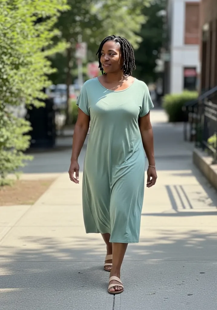 A sage green midi dress with a relaxed fit creates a calm and effortless spring look. The fabric flows gently and feels breathable for daytime wear. Simple sandals finish the outfit with an understated vibe.