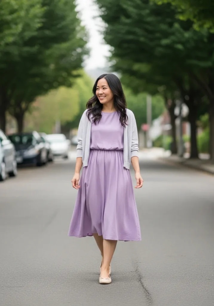 A flowy lavender midi dress takes center stage here with its soft pastel color and breezy movement. The dress is paired with a lightweight cardigan in a similar gentle tone which adds a cozy layer without weighing the outfit down. Simple shoes keep the focus on the color and silhouette.