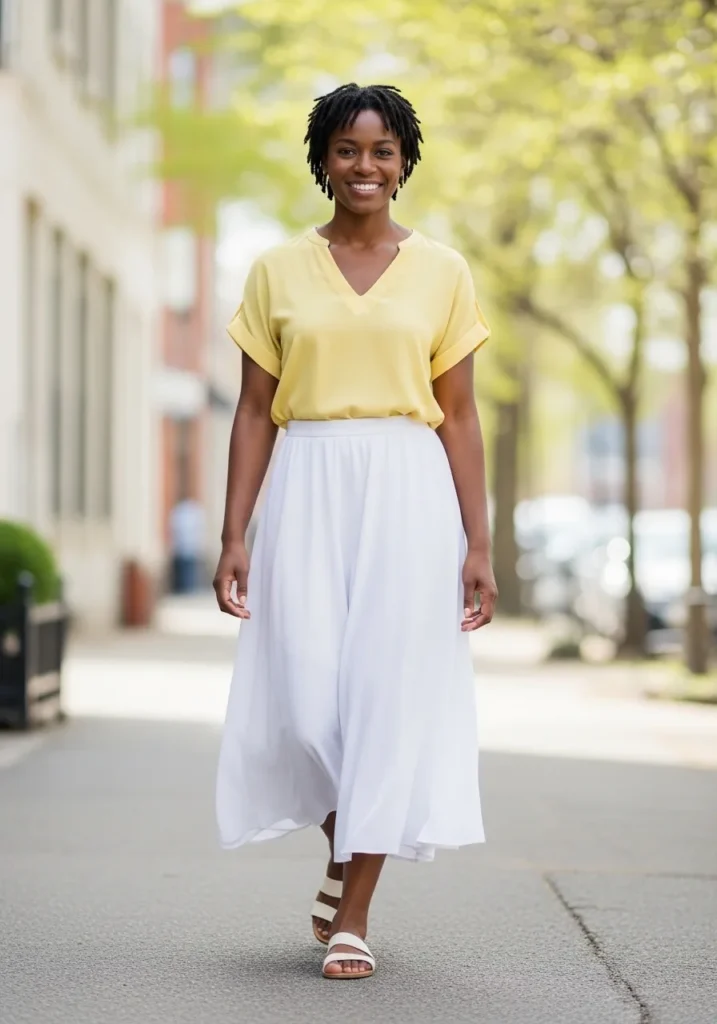 A buttery yellow short sleeve top brings warmth and softness to this outfit and pairs beautifully with a white midi skirt. The skirt flows lightly with movement and keeps the look airy. Simple sandals make it feel casual and perfect for spring days.