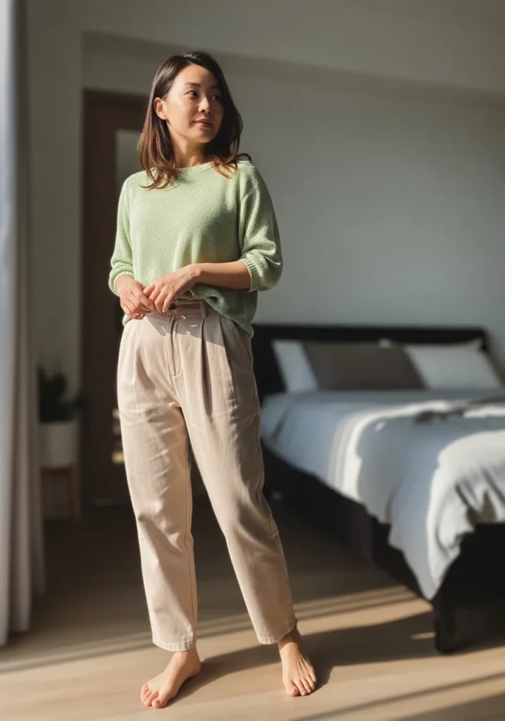 A mint green long sleeve top is paired with beige trousers for a soft and soothing color combination. The fabrics look lightweight and comfortable which suits spring perfectly. Barefoot styling or simple flats keep the look natural and relaxed.