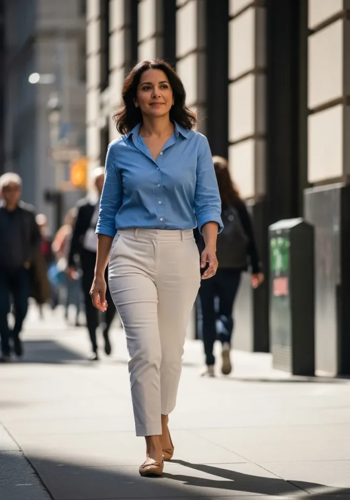This look feels timeless and easy to wear. The pastel blue softens the outfit and makes it feel fresh without being trendy. I like how it works for errands or casual meetings without feeling stiff.